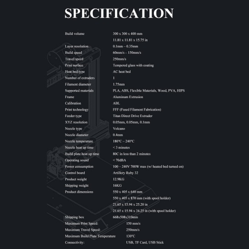 Build Volume: 300 x 300 x 400 mm/11.81 x 11.81 x 15.75 in