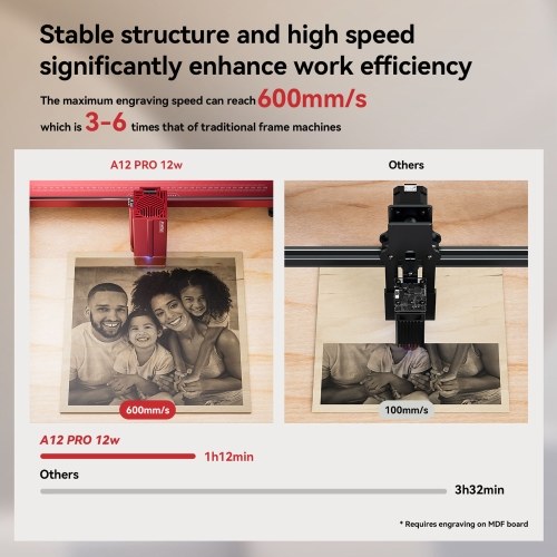 4. More stable and high-speed structure: The bottom frame of the A12Pro is formed in one piece, and the X-axis metal adopts a dual-axis guide rail structure. The working jitter is very small, ensuring that the machine does not jitter when running at a high speed of 500mm/s (the data is the mechanical movement speed of the frame, low The power machine needs to turn down the speed otherwise the engraving marks will be very shallow).
