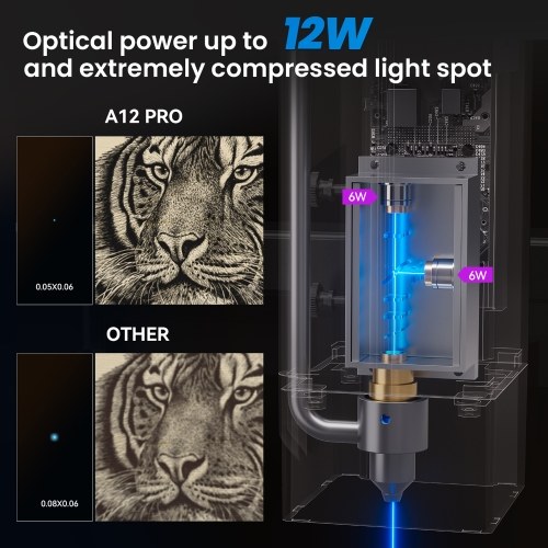 3. Second-generation blue-light laser spot compression process: The A12Pro laser adopts the second-generation laser spot compression process, which further compresses the laser spot and significantly improves cutting capabilities. Compared with machines of the same level, the cutting capacity is increased by 30%.