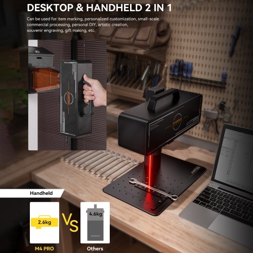 Desktop & Handheld 2-in-1: 100x100mm engraving format, capable of horizontal and non-horizontal engraving, suitable for more scenarios such as mass production, souvenir carving, personalized customization, gift making, etc. It is also compatible with chuck and roller accessories (accessories need to be purchased separately), which can process spheres, cylinders and other items;