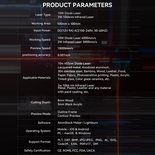 Dual light source module: Atomstack M4 PRO equipped with 2 types of laser source - 10W Diode Laser and 2W 1064nm Infrared Laser, this means it suitable for most metal and non-metal material up to 300+ in total.
