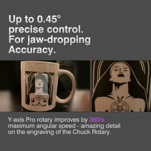 Chuck Rotary: Y-axis Rotary Pro lets you customize your engravings in fun new ways. Bring a mug to life by engraving it with your favorite design. Complete with thumbtacks. You can also see your favorite lifestyle items personalized.