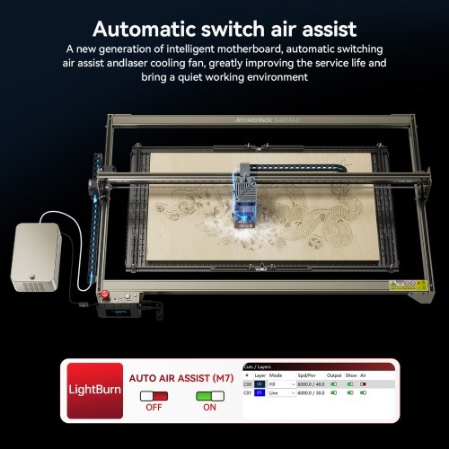 This ATOMSTACK S40 Max 40W laser engraving machine not only has powerful functions, but also is easy to operate, allowing me to easily realize various creative designs. I really like the one-button switch between engraving/cutting modes on this laser engraver. With the button, I can easily switch between 20W and 48W power, selecting different modes according to different engraving and cutting tasks. This design allows me to do fine carvings as well as powerful cuts, very convenient!