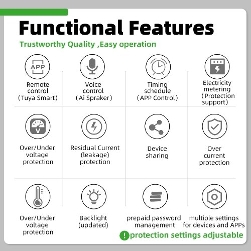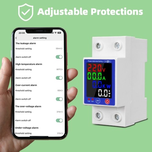 This intelligent circuit breaker integrates over-voltage, under-voltage, over-current, leakage, temperature protections, and other functions in one, comprehensively protecting the circuit safety. Intelligent identification of leakage, when it occurs overvoltage and overcurrent, the protector will automatically cutoff the powersupply to protects home appliances, if the fault has been eliminated, it will automatically reclose and turn on the power. Physical button design, the protecting thresholds can be set as you need, sensitive operation, and comfortable hand feeling. Suitable for many scenarios such as power distribution room, home electricity management, on-site equipment control, camera management, room lighting management, household appliances, and so on.