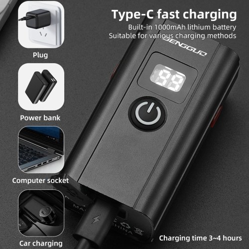 The bicycle headlight has a built-in rechargeable 1000mAh lithium battery, and it takes 3-4 hours to charge. USB charging can charge the lamp anytime.
