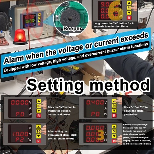 【Buzzer Alarms】: Equipped with low voltage, high voltage, and overcurrent buzzer alarm functions, which can issue an alarm when the voltage or current exceeds the set threshold to ensure the safety of the device and the user. Supports adjustment of the low voltage, high voltage, and overcurrent alarm parameters, allowing users to set the instrument according to their requirements, improving measurement accuracy.