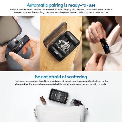 【Universal Compatibility】 Comes with a 3.5mm TRS analog output, USB-C, and iOS Lightning digital output, the wireless microphone set can be used with a wide range of devices, including cameras, smartphones, and computers.
