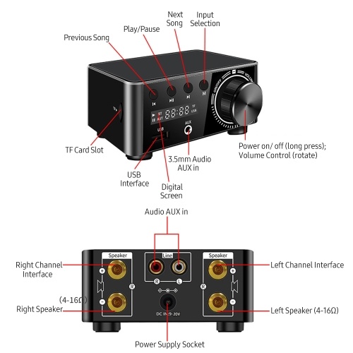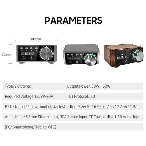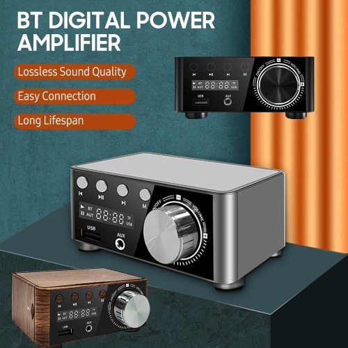 2-channel digital power amplifier adopts BT 5.0 stable transmission and brings lossless sound quality for you. It supports U-disk and TF card playback and can be connected to the mainstream smart devices such as PC, laptop, smart phone, tablet, CD player, music player, TV, set top box and so on. Compact and lightweight, easy to carry.