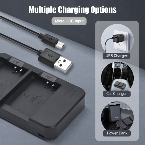 【High-quality Battery Charger】The battery charger features 2 slots for charging 2pcs batteries at one time, and equipped with micro USB charging ports for added convenience.