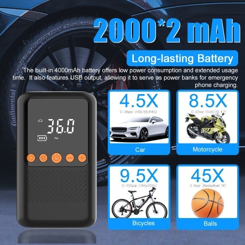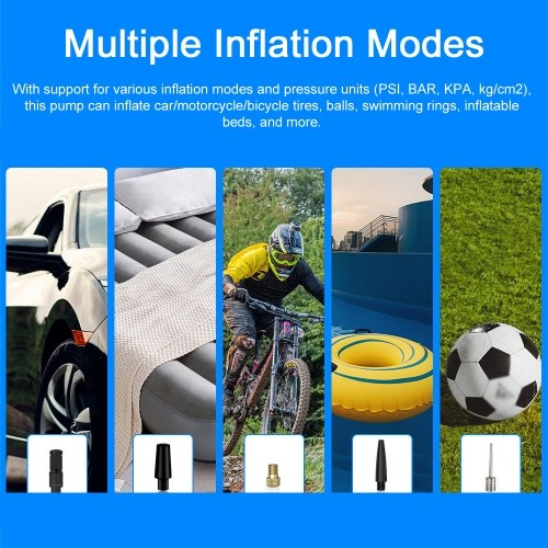 Multiple Inflation Modes: With support for various inflation modes and pressure units (PSI, BAR, KPA, kg/cm2), this pump can inflate car/motorcycle/bicycle tires, balls, swimming rings, inflatable beds, and more.