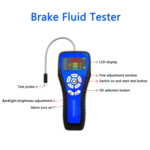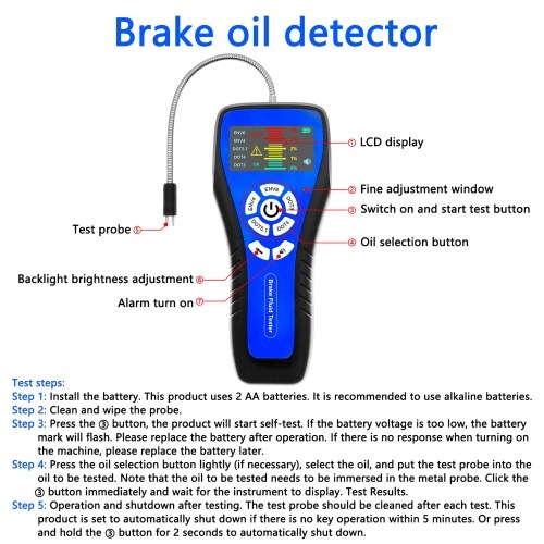 This brake fluid tester features an easy-to-use operation system with buttons for starting a self-test and selecting the type of oil to be tested. Upon pressing the start button, it conducts a self-test including checking if battery voltage is sufficient. The device also has an automatic shutdown feature that activates if there are no key operations within 5 minutes. To use, simply press the oil selection button, choose your oil type, and immerse the metal probe into the oil you want to test. Following this, wait for your results on its display screen.