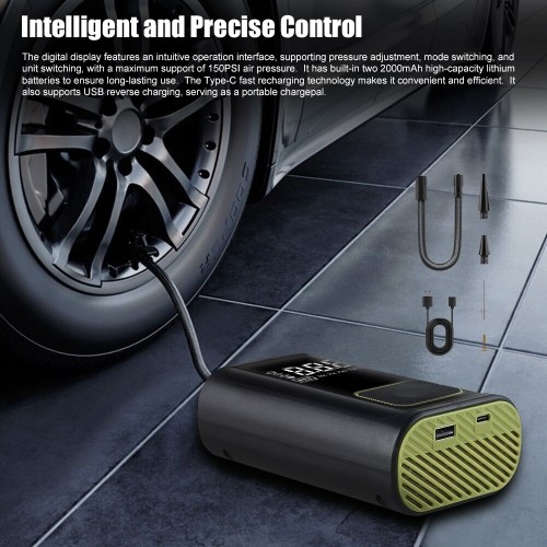 【Intelligent and Precise Control】: The digital display features an intuitive operation interface, supporting pressure adjustment, mode switching, and unit switching, with a maximum support of 150PSI air pressure. It has built-in two 2000mAh high-capacity lithium batteries to ensure long-lasting use. The Type-C fast recharging technology makes it convenient and efficient. It also supports USB reverse charging, serving as a portable chargepal.
