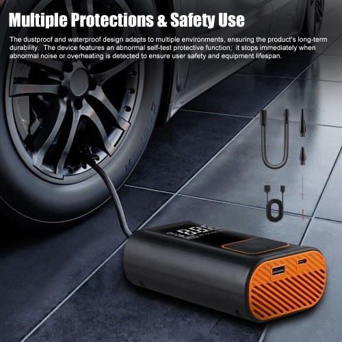The package includes the host, an inflatable tube, a Type-C cable, an adapter, and three types of nozzles for quickly adapting to inflate various items, such as automobiles, motorcycles, bikes, and balls, meeting diverse needs. The digital display features an intuitive operation interface, supporting pressure adjustment, mode switching, and unit switching, with a maximum support of 150PSI air pressure. Four inflation modes (car, motorcycle, bike, ball) and units (BAR, PSI, KPA, KG/C㎡) are available to meet your various needs. The night illumination function ensures worry-free operation in dim environments.