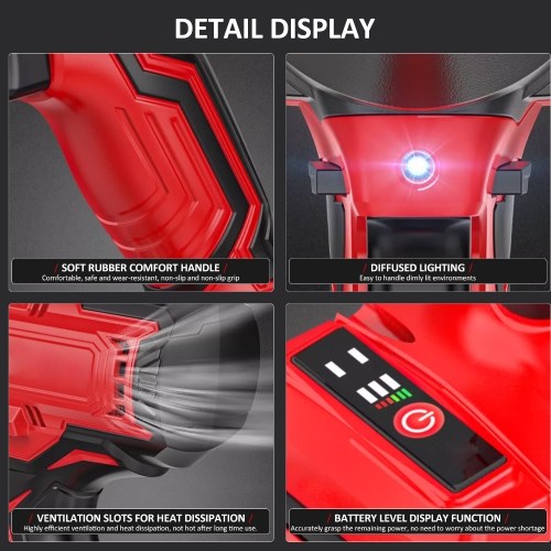 【LED Light Built-in】Equipped with LED work lights, our cordless impact wrench will automatically light up your working area when you press the switch trigger, which helps improve your visibility when working in the dark.