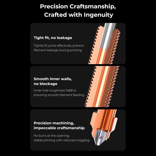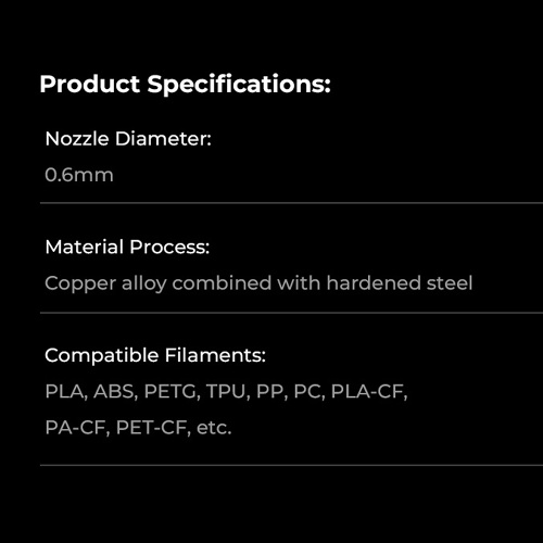 Upgraded material, suitable for printing a variety of filaments. The heat break is made of titanium alloy, which reduces heat conduction. The nozzle is composed of copper alloy and hardened steel, supporting the printing of various filaments.