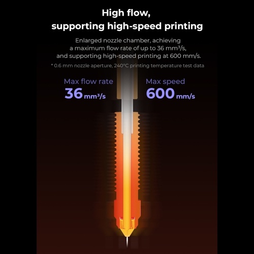 High flow, supporting high-speed printing. Enlarged nozzle chamber, achieving a maximum flow rate of up to 36 mm3/s, and supporting high-speed printing at 600 mm/s.
