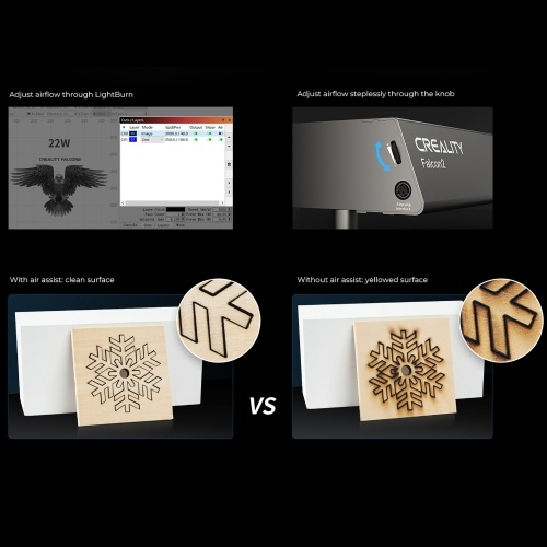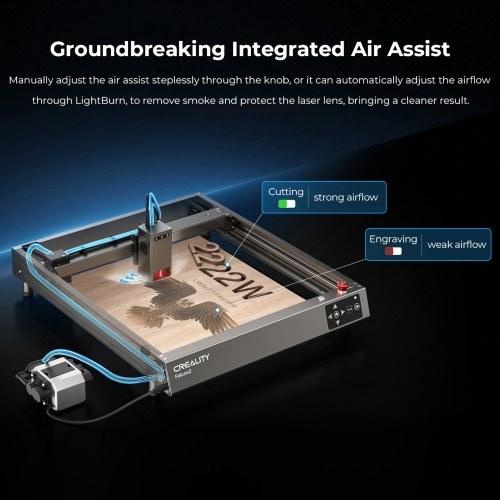 Creality Falcon 2 arrived in Italy quickly, well packaged, modular design for easy assembly, and can be assembled within 30 minutes. When cutting, you can manually adjust the air assist through the knob, or you can automatically adjust the airflow through the LightBurn software to remove smoke and make the cutting cleaner and more beautiful. Other than that, colorful designs can be engraved, which surprised me, great laser machine!
