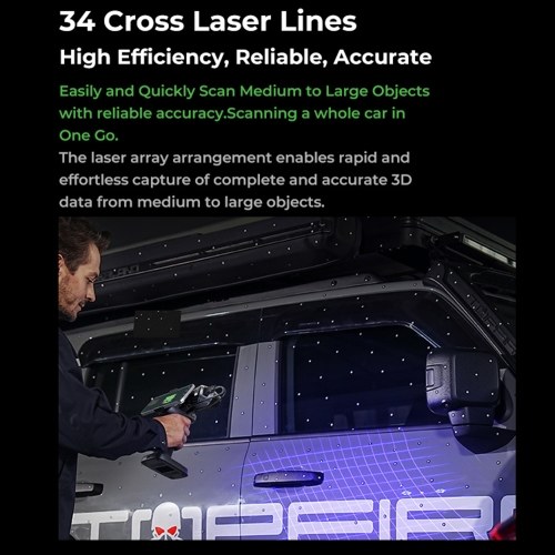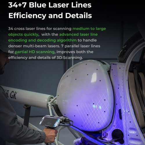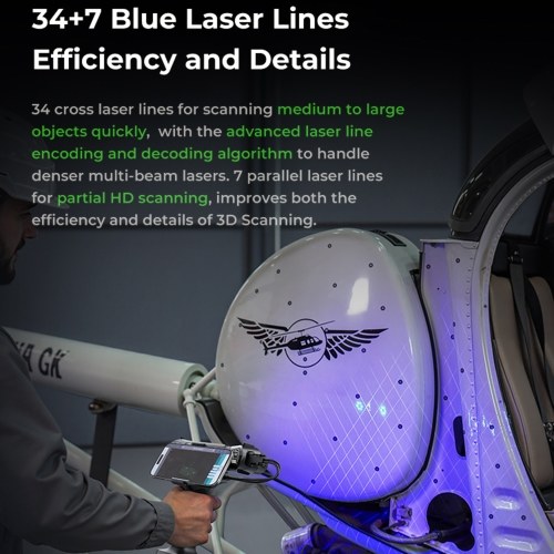 【World's 1st Wireless Hybrid Blue Laser Line & NIR Scanner】34 cross laser lines for scanning medium to large objects quickly, with the advanced laser line encoding and decoding algorithm to handle denser multi-beam lasers. 7 parallel laser lines for partial HD scanning, improves both the efficiency and details of 3D Scanning.