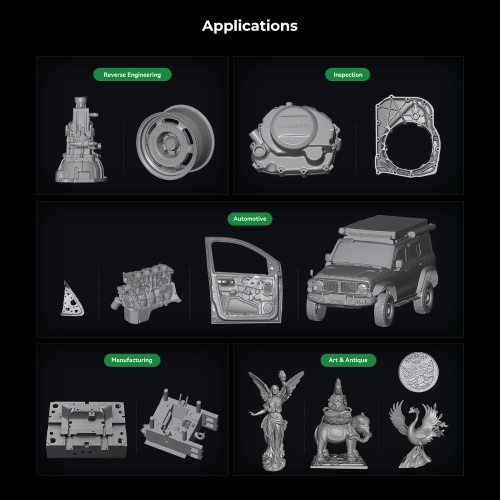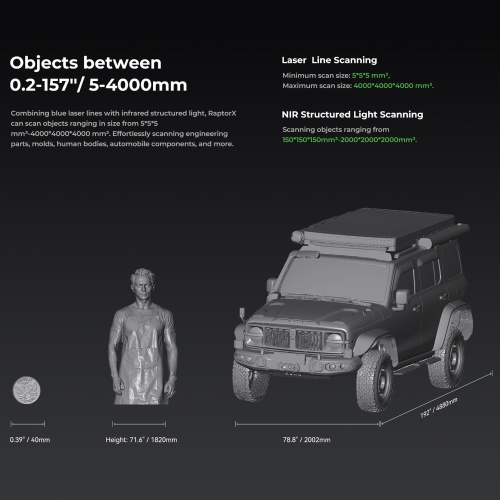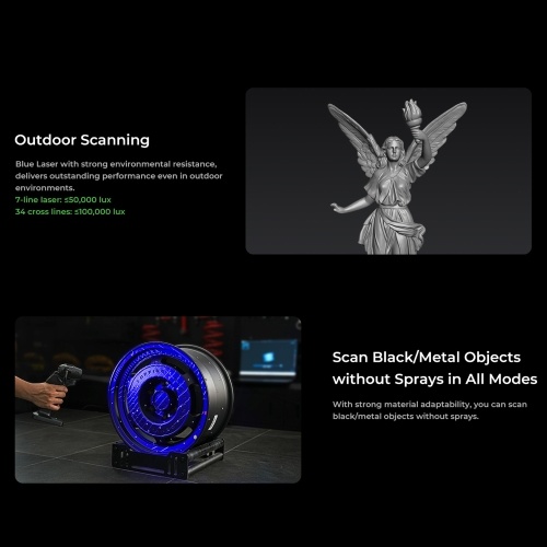 【High-Speed Scanning】 Blue light scanning speed up to 60fps, NIR scanning speed up to 30fps. The 34 cross laser lines can process up to 1,020,000 points per second, making it ideal for quickly scanning medium to large objects. Combining line with infrared structured light, the scans object ranging in volume from 5*5*5 mm,-2000*2000*2000 mm, effortlessly scanning small figurines, bolts, faces, human bodies, automobile components, and more, versatile scanning for all sizes.