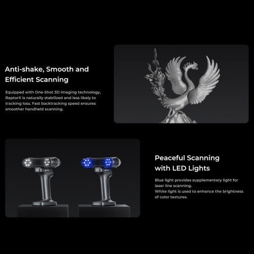 【24-Bit Full-Color Scanning】Raptor 3d scanner equipped with 12 circular LED texture lights, it can enhance the brightness of color mapping in dark environments and truly present the color of objects. Dual-color circular LED texture lights can help achieve more realistic scanning results. Blue Light provides supplementary light for laser line scanning. White Light used to enhance the brightness of color textures.