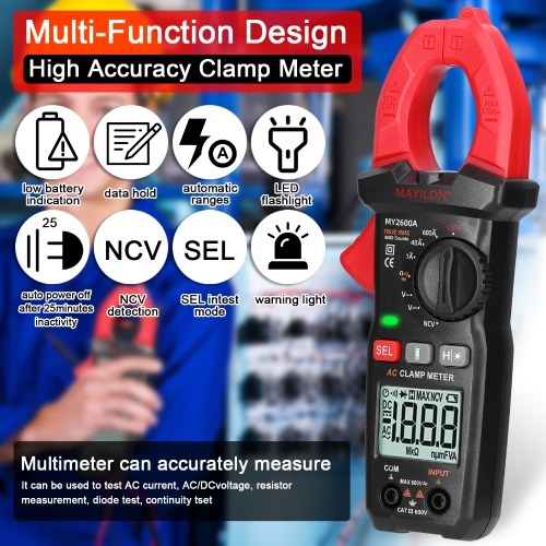 【Multi-Function Design】: Auto-ranging clamp meter with multiple functions in one, data hold, LED flashlight, auto power off after 25 minutes no operation, warning light, SEL intest mode( select between diode, resistor and continuity), etc.
