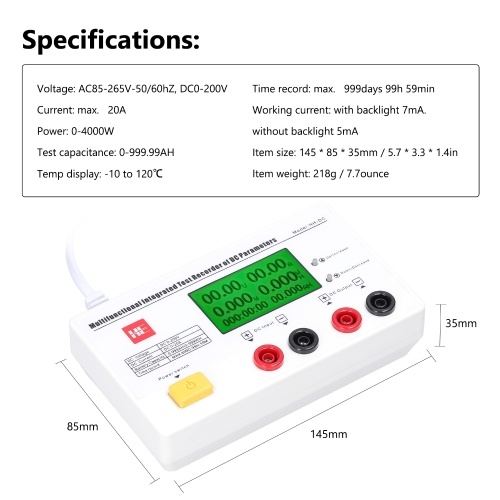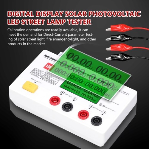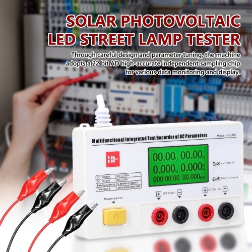 This product is a professional Direct-Current testing instrument with high accurate as its basic function. It fully combines the actual usage environment and functional requirements. Through careful design and parameter tuning, the machine adopts a 22 bit AD high-accurate independent sampling chip for various data monitoring and display. The ultrawide working voltage is almost suitable for common lithium batteries or leadacid batteries on the market. At the same time, it has temperature monitoring and alarm functions, diversified backlight setting functions, supports constant light, automatic or fixed delay shutdown functions, perfect alarm functions, can set voltage upper and lower limits, current upper and lower limits alarm prompts, visual menu setting function, fullycharged self stops, countdown, built-in 20A shunt simplifies external wiring. Calibration operations are readily available, It can meet the demand for Direct-Current parameter testing of solar street light, fire emergencylight, and other products in the market.