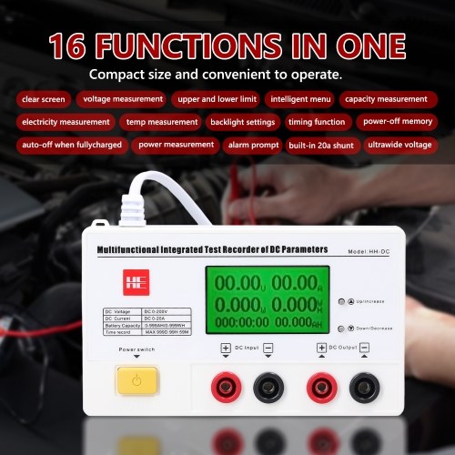 16 functions in one: voltage measurement, electricity measurement, clear screen, upper and lower limit, temp measurement, backlight settings, auto-off when fullycharged, power measurement, intelligent menu, timing function, alarm prompt, capacity measurement, power-off memory, ultrawide voltage, built-in 20a shunt.