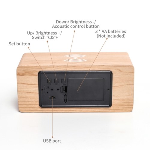 This alarm clock adopts energy-saving design, pressing "Down" button to turn on acoustic control, and you can wake it up (display time)by clapping. Note: The sound should be over 60db.