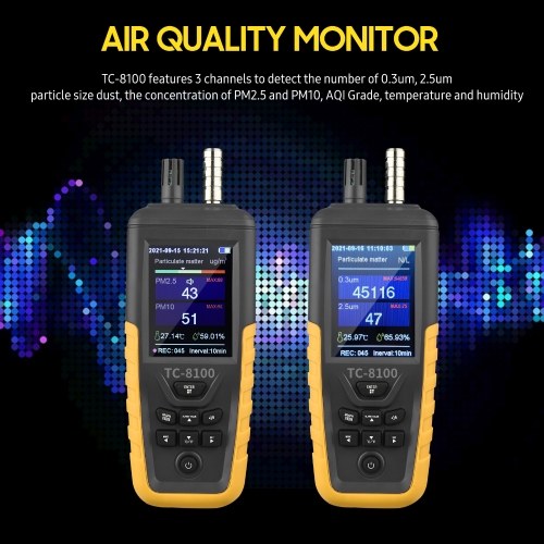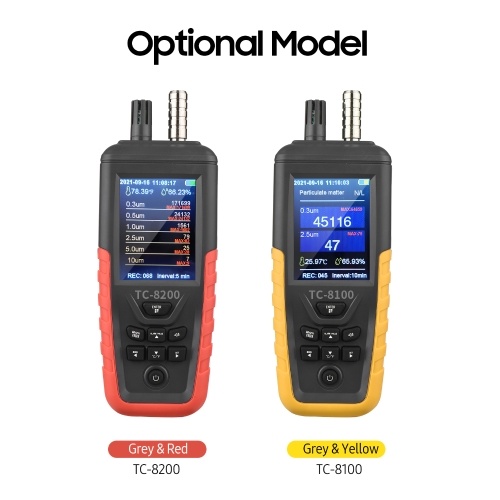 Air Quality Monitor: There are 2 models for option. TC-8100 features 3 channels to detect the number of 0.3um, 2.5um particle size dust, the concentration of PM2.5 and PM10, AQI Grade, temperature and humidity. TC-8200 features 6 channels to detect the number of 0.3um, 0.5um, 1.0um, 2.5um, 5.0um, 10um particle size dust, the concentration of PM2.5 and PM10, and it can detect the class of Class 100 clean room and below clean room, temperature, humidity and AQI Grade.