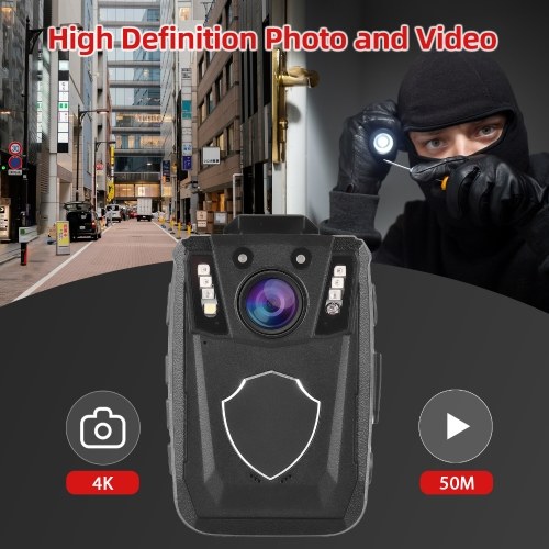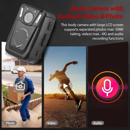 【Body Camera with Audio & Video & Photo】This body camera with large LCD screen supports separated photo(max.50M) taking, video(max. 4K) and audio recording functions, making it ideal for law enforcement, delivery jobs, traveling, etc.