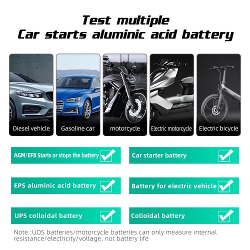 【Recommended Battery Types】: Test multiple car starts aluminic-acid battery, AGM/EFB Starts or stops the battery, car starter battery, EPS aluminic acid battery, battery for electric vehicle, UPS colloidal battery, colloidal battery. (Note :UOS batteries/motorcycle batteries can only measure internal resistance/electricity/voltage, do not support to test battery lifespan.)