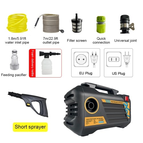 【Pressure Washer】: This electric power washer is perfect for various cleaning tasks, such as washing cars, air conditioners, windows, and floors. With a 7m water outlet hose and a 1.8m water inlet hose, it provides a powerful flow rate of 8L/min and operates at a high pressure of 100bar. Its automatic and portable design makes it an ideal choice for car washing and other cleaning needs.