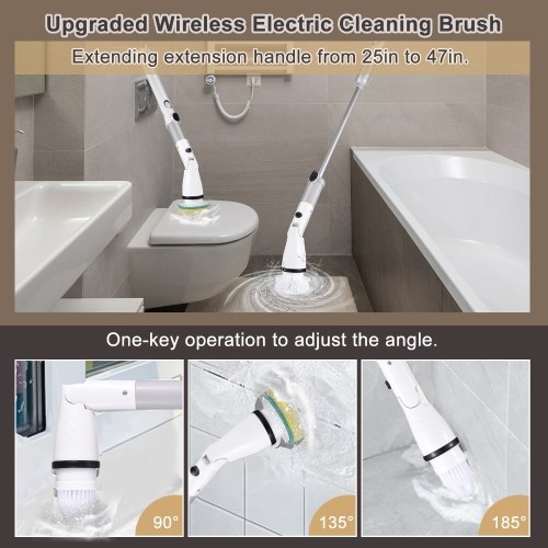 Equipped with detachable extension handle, the electric cleaning Brush can extend from 25in to 47in without bending over to clean. The angel of brush heads can be adjusted as 90°/135°/180°with one-key operation for cleaning without dead ends.