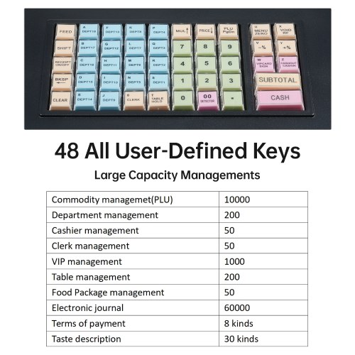 [Expandable Capacity for Business Growth] Featuring a mechanical keyboard with separate keys and a user-defined key design, this cash register offers a large capacity that can accommodate up to 10,000 commodities, 50 cashiers, 50 clerks, 200 departments, and 60,000 electronic journal entries.