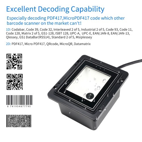 Decode Type: 1D (EAN-8, EAN-13, EAN-13 2 add-on, EAN-13 5 add-on, ISSN, ISBN, UPC-A, UPC-E, Code 39, Code 93, Code 128, Codabar, Industrial 2 of 5, Interleaved 2 of 5, Matrix 2 of 5, Standard 25, GS1 DataBar(RSS14), GS1 DataBar Limited, GS1 DataBar Expanded, ISBT-128, GS1-128, code39FULLASCII, Plessey, MSI plessey); 2D(PDF417, Micro PDF417, QRcode, MicroQR, Datamatrix)