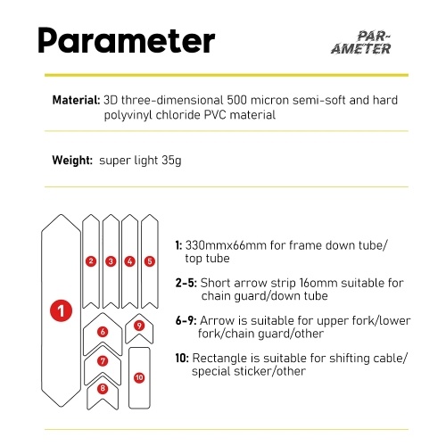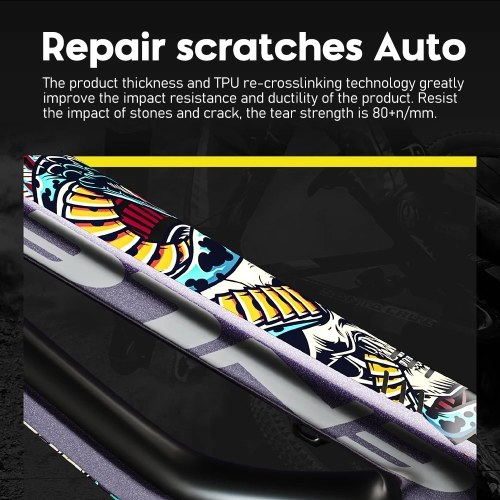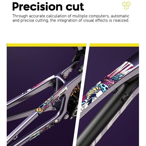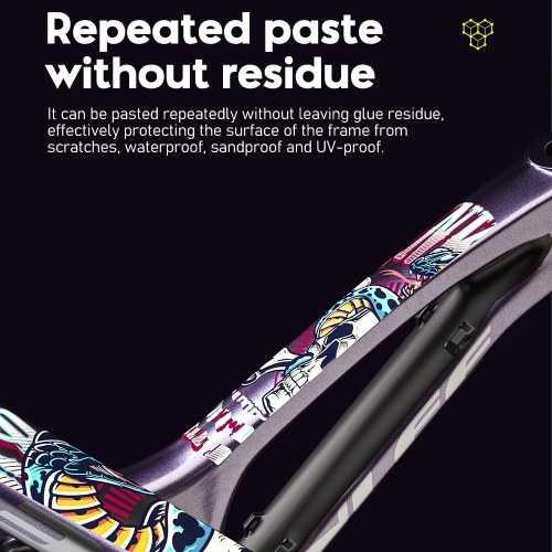 Offers a wide scope of vibrant colors and distinctive types, allowing cyclists to personalize their bikes with eye-catching designs. The film is designed for effortless application, making it easy to stick onto the bike frame. It can be instantly used without any additional tools or waiting time. Our fashionable bike stickers will not leave any trace after you take them off. It can protect your bike from scratches when you use it, and also stop the aging of bicycle metal caused by ultraviolet radiation and rain. Our bicycle frame stickers are versatile and can be applied to various parts of the bike, including the frame, fork, handlebars, and more.
