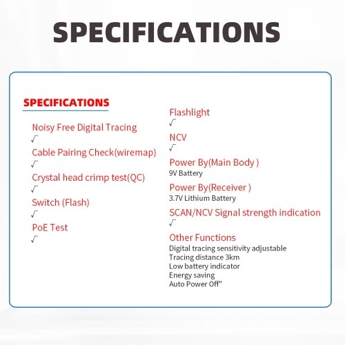 This product integrates network routing, crystalhead crimping testing, alignment, POE voltage measurement, and switch port flashing functions. It is a multi-purpose line positioning product designed using high speed data transmission technology based on longterm engineering practice experience. It has the characteristics of long transmission distance, clear sound, and complete functions, making it a practical tool for laboratory, factory wiring, and various communication line installation and engineering maintenance personnel. Digital Tracing Cables function can quickly and efficiently find the required cables from a large number of cables. Widely used in engineering applications such as telephone systems, computers networks, video networks, and other metal wire lines. Adopts the latest digital noiseless line finding technology to provide you with a better line finding experience.