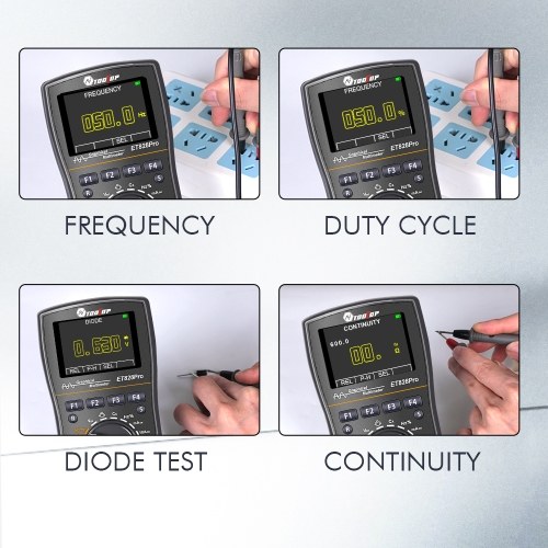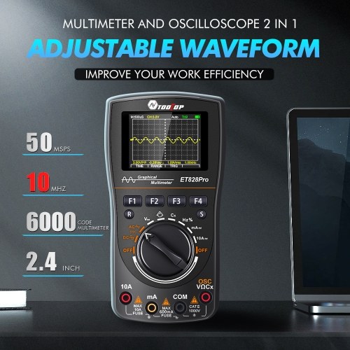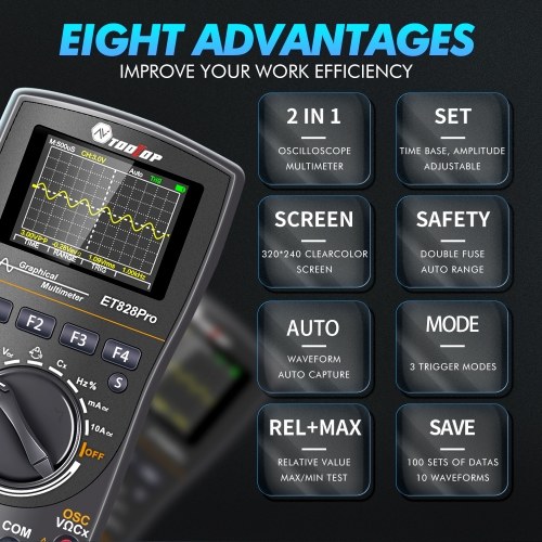 The product is an example of a combination of an oscilloscope and a autorange multimeter. Support oscilloscope and multimeter dual modes switching. It can simultaneously measure a variety of electrical parameters or capture waveforms, and display the electrical parameters or waveforms of electrical signals. Supports AC and DCvoltage, AC and DCcurrent, resistance, capacitance, diode, on/off test. Multifunctional design, with waveform adjustment, data storage, automatic shutdown, and with overload protections functions. It can easily handle measurement in various fields, widely used in the fields of testing and debugging of electronic circuits, troubleshooting and repairing of electronics, communications, computers, etc.