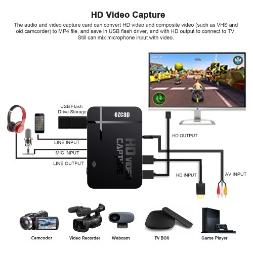 The audio and video capture card can convert HD video and composite video (such as VHS and old camcorder) to MP4 file, and save in USB flash driver, and with HD output to connect to TV. Still can mix microphone input with video. Suitable for recording teaching material, medical imaging, game live broadcast, etc.