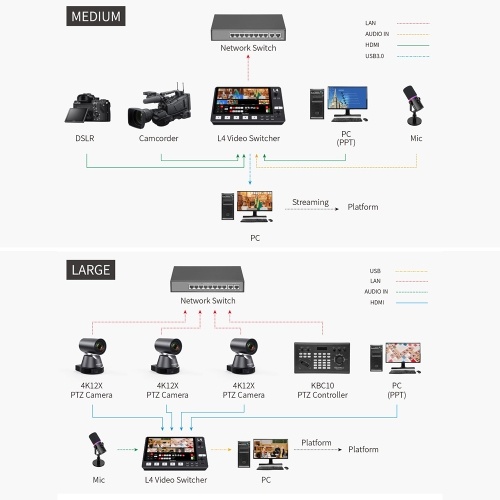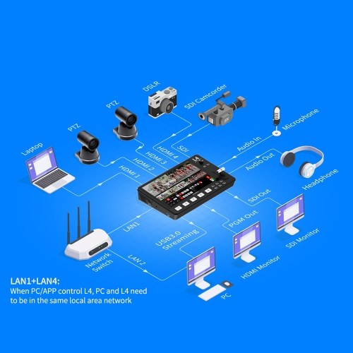【4 HDMI Inputs & 1 HDMI Output】Equipped with 4 HDMI inputs, this device allows seamless connection of cameras, computers, and laptops. Additionally, it features 1 HDMI output for convenient external 1080P video transmission. The inclusion of a LAN interface enables easy computer connection for PC control, while also providing support for phone APP control.