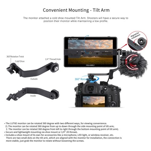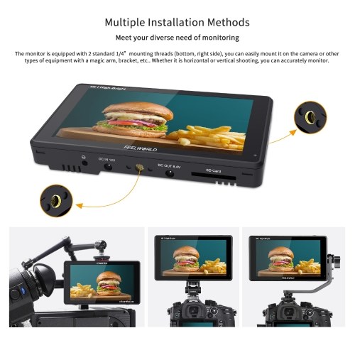 【Versatile Mounting Options】The 6-Inch IPS monitor features two standard 1/4in mounting threads (bottom and right side) that allow you to mount it on a camera or other device, whether in landscape or portrait orientation.