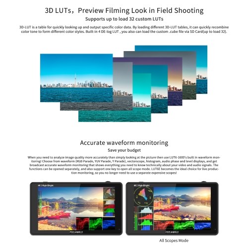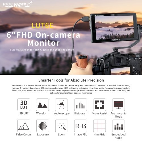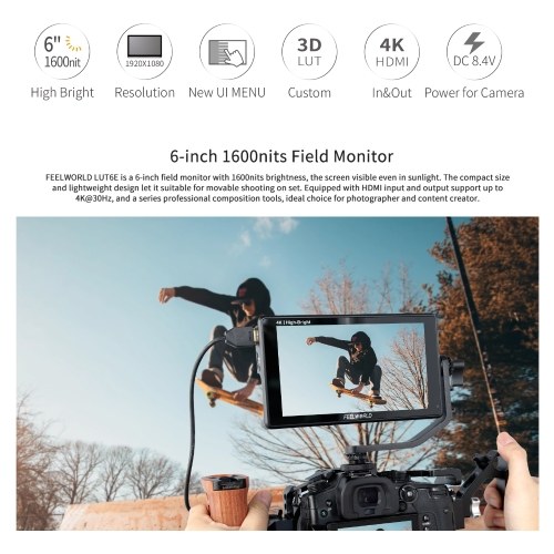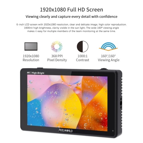 【Clear and Vivid Display】Equipped with a 6-inch 1920x1080 resolution screen, the camera field monitor provides clear and detailed images with high color accuracy. With a brightness of 1600nit, the screen is visible even in bright sunlight, and the 160° wide viewing angle allows multiple crew members to monitor the footage.