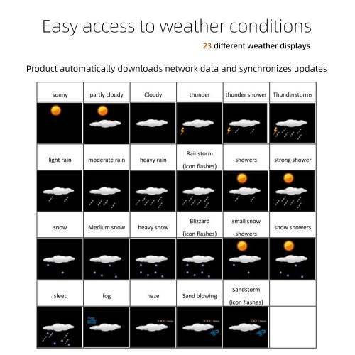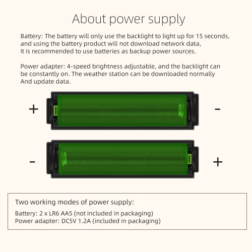【Backlight】Only when the power adapter is working can the backlight be turned on continuously, 4 levels brightness adjustable. The weather station can be downloaded normally and update data. The battery will only use the backlight to light up for 15 seconds, and using the battery product will not download network data. It is recommended to use batteries as backup power sources.