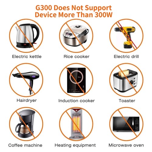 【7 Charging Output Ports】G300 portable generator support multiple outputs: 2*DC ports, 3* USB port,2*AC output. Offer fastest and high-efficient charging for your devices. Can charge 7 devices simultaneously.