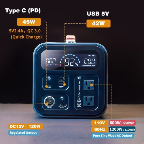【Larger Capacity & Higher Power】 Built-in 297600mAh/1100Wh rechargeable lithium power pack,1200W continuous output and 2000W peak output pure-sine wave power enough to meet your various power supply needs. Perfect emergency power backup for home/travel/camping.