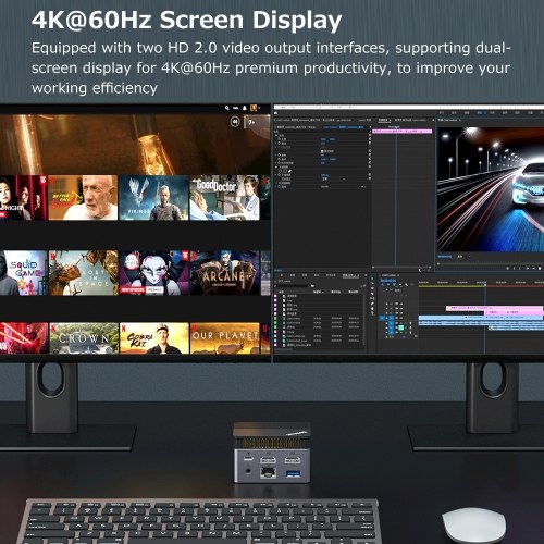This mini PC provides 3*USB3.2, 2*HD(4K@60Hz), 1*3.5mm jack, 1*Type-C power port, 1*1000M RJ45 and 1*TF card slot for plug-and-play functionality for a full range of simultaneous work and entertainment applications.