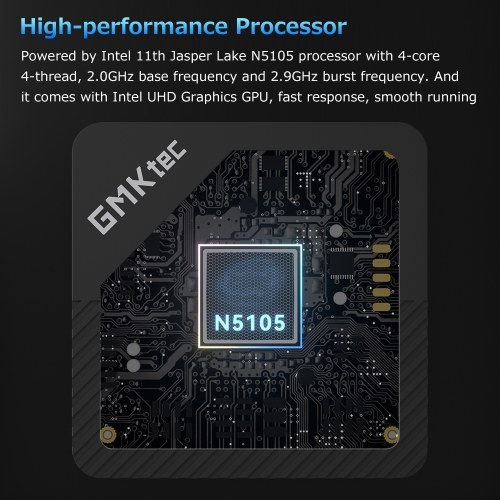 Powered by Intel 11th Jasper Lake N5105 processor with 4-core 4-thread, 2.0GHz base frequency and 2.9GHz burst frequency. And it comes with Intel UHD Graphics GPU, fast response, smooth running.