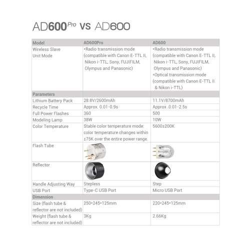 600Ws strong power flash, 9 steps(1/256~1/1) power adjustment. The 28.8V/2600mAh rechargeable lithium battery can provide 360 full power flashes and recycle in 0.01~0.9s. Two power supply methods with great flexibility.