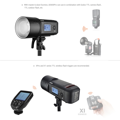 With Master & Slave function, AD600Pro can be used with Godox TTL camera flash, TTL outdoor flash & etc. It has 5 groups, 32 channels and 100m transmission range.