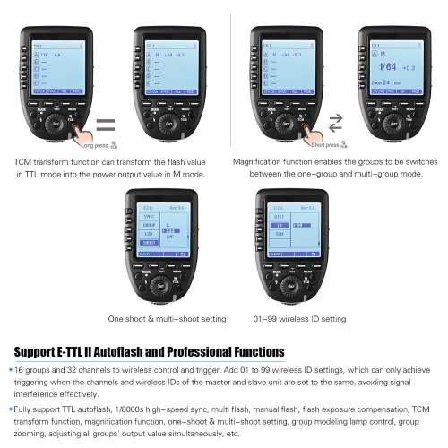 Fully support TTL autoflash, 1/8000s high-speed sync, multi flash, manual flash, flash exposure compensation, TCM transform function, magnification function, one shoot & multi-shoot setting, group modeling lamp control, group zooming, adjusting all groups' output value simultaneously, etc.